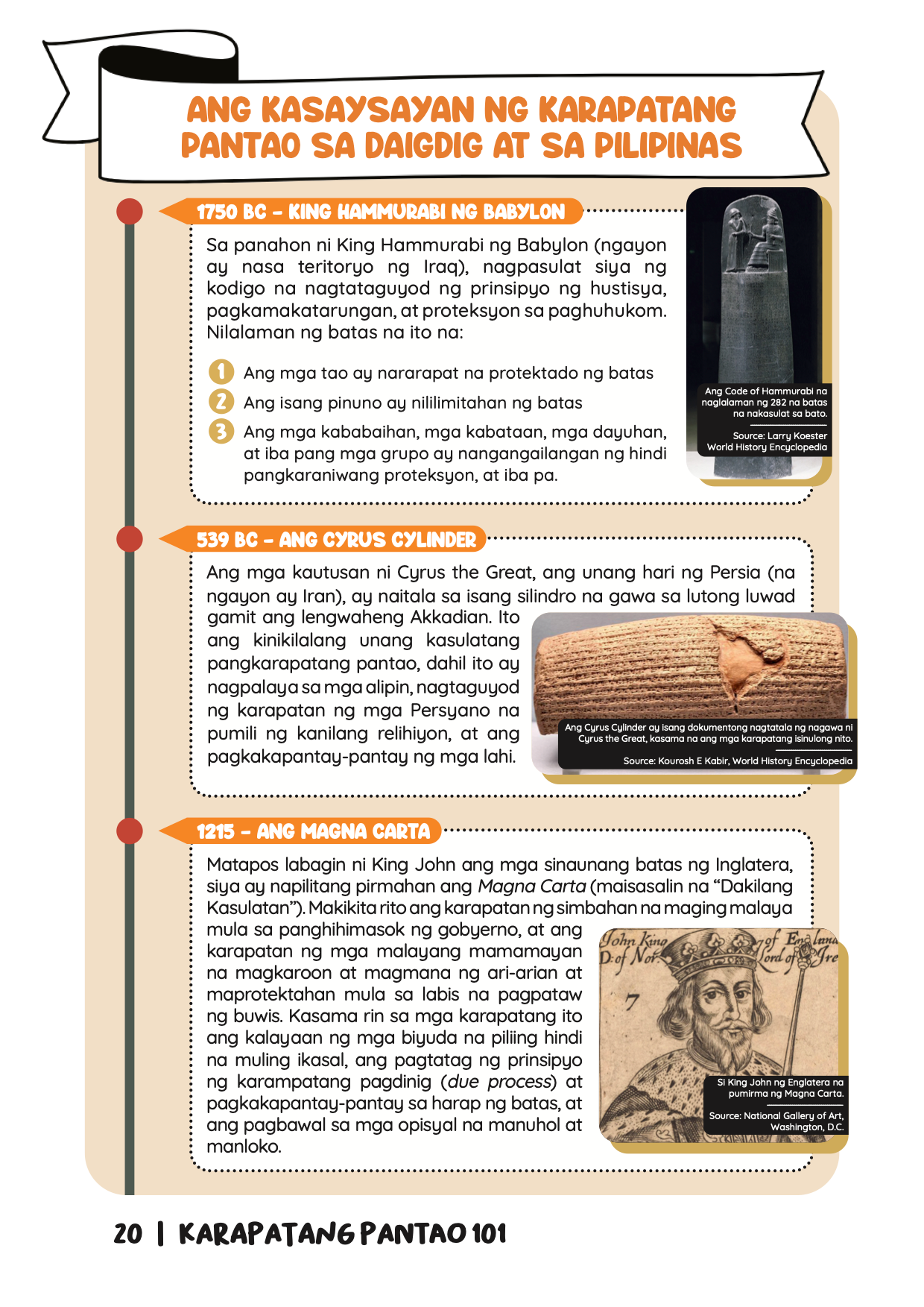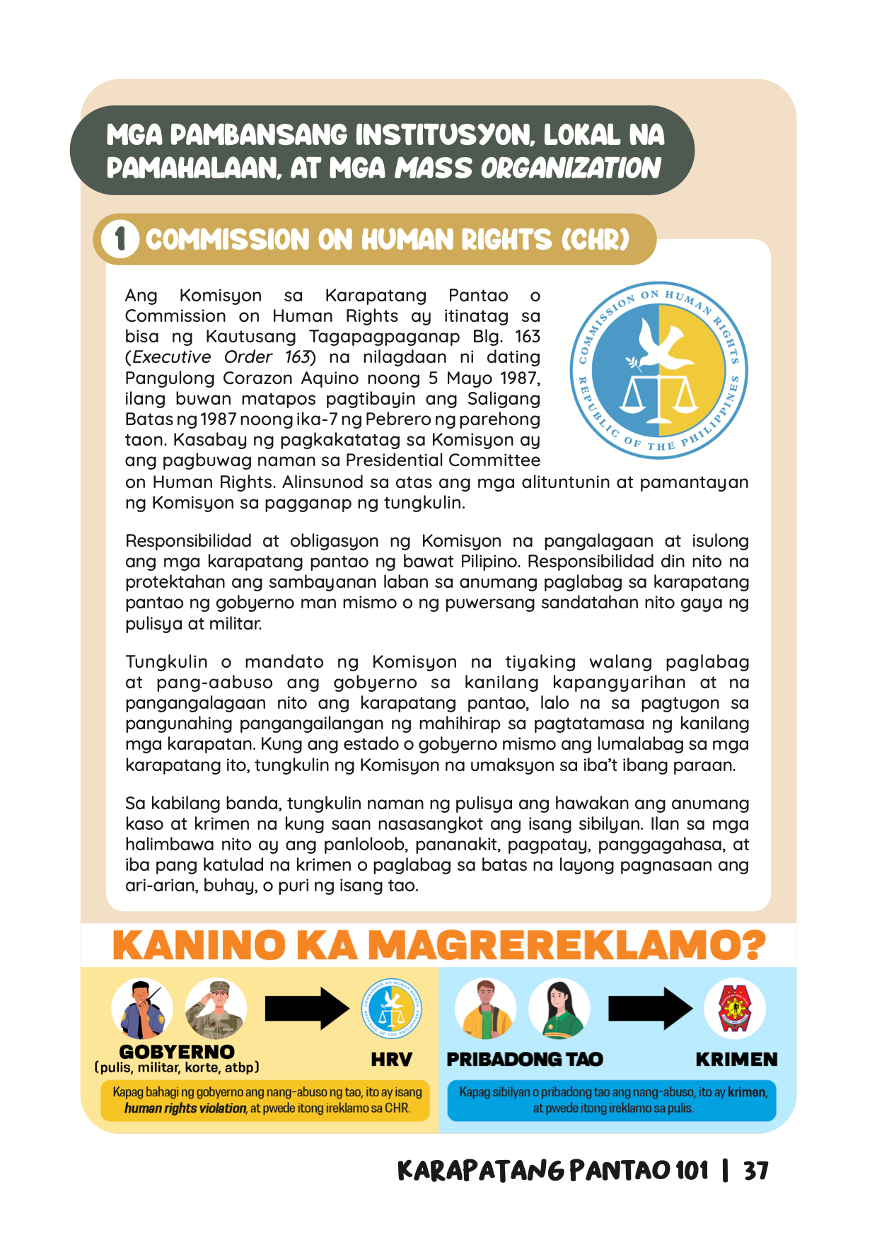 Karapatang Pantao 101 (Human Rights 101) is the final product of a project by the Initiatives for Dialogue and Empowerment through Alternative Legal Services (IDEALS) in partnership with the Commission on Human Rights of the Philippines (CHR) and the Catholic Education Association of the Philippines (CEAP) to better integrate human rights education (HRE) into the Philippine basic education curriculum. Released in 2023, the handbook contains a brief discussion of the history, concepts, and practical uses of human rights in everyday life, with the aim of being used as an instructional supplement for teachers in the Philippines, with sample lesson plans and activities included for this purpose.